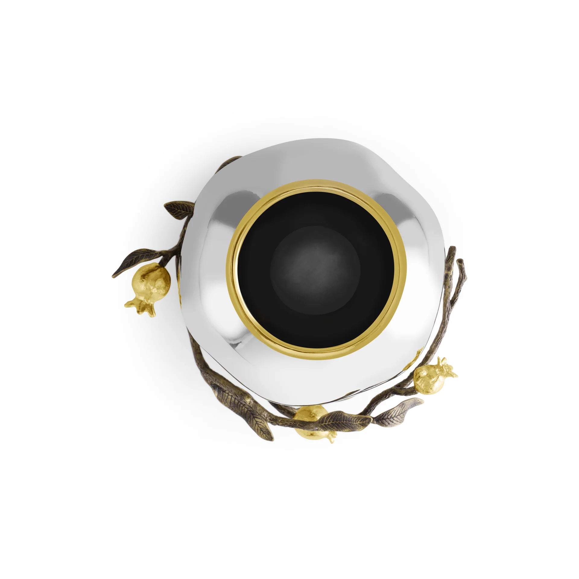 Elevate your home décor with this stunning Pomegranate Vase by Michael Aram. Crafted from lustrous stainless steel, it features an exquisite organic branch adorned with gold-plated pomegranates that catch the light beautifully. Beyond its visual appeal, the pomegranate symbolizes luck and fertility, making this an meaningful addition to any room. A captivating statement piece that brings both artistry and positive symbolism to your space.