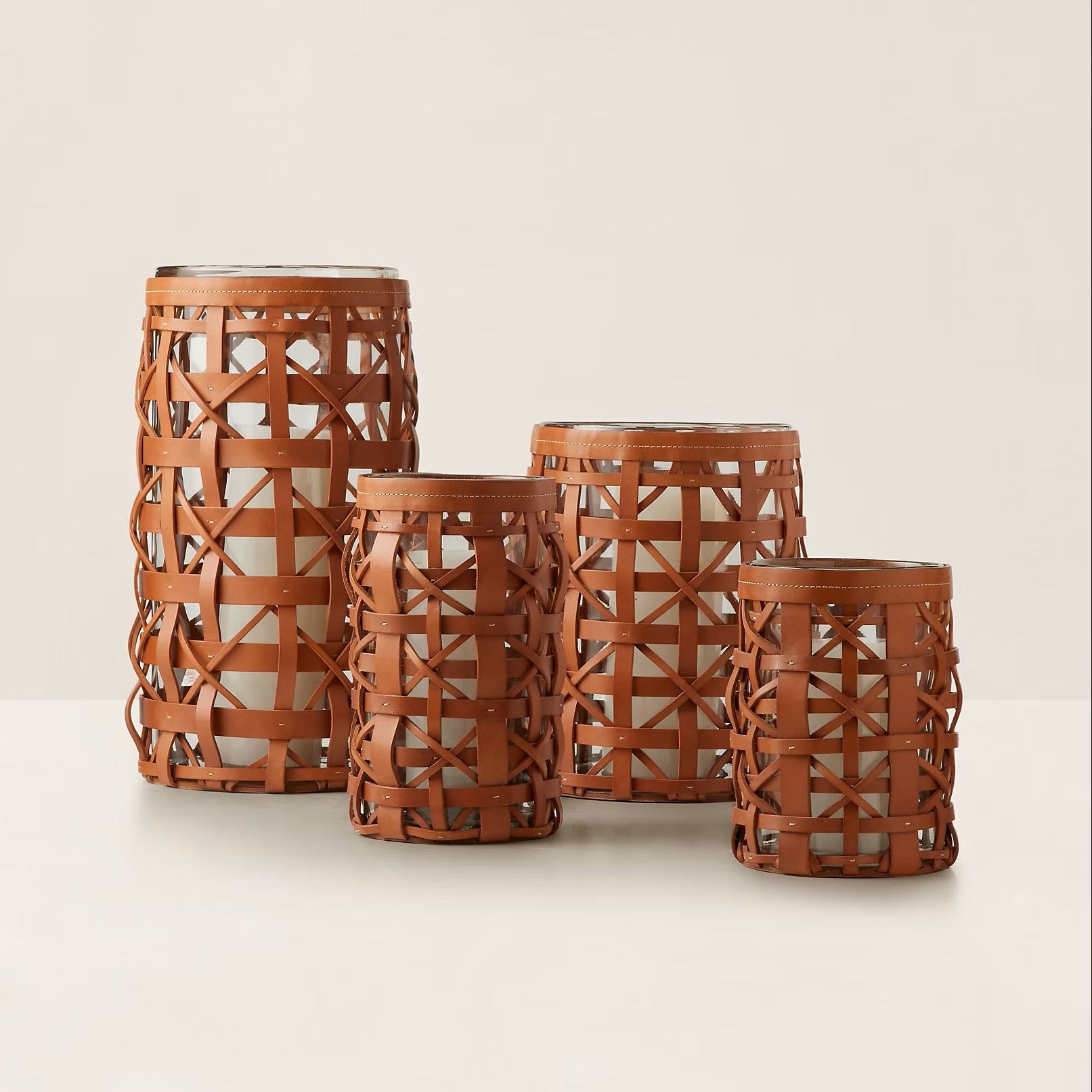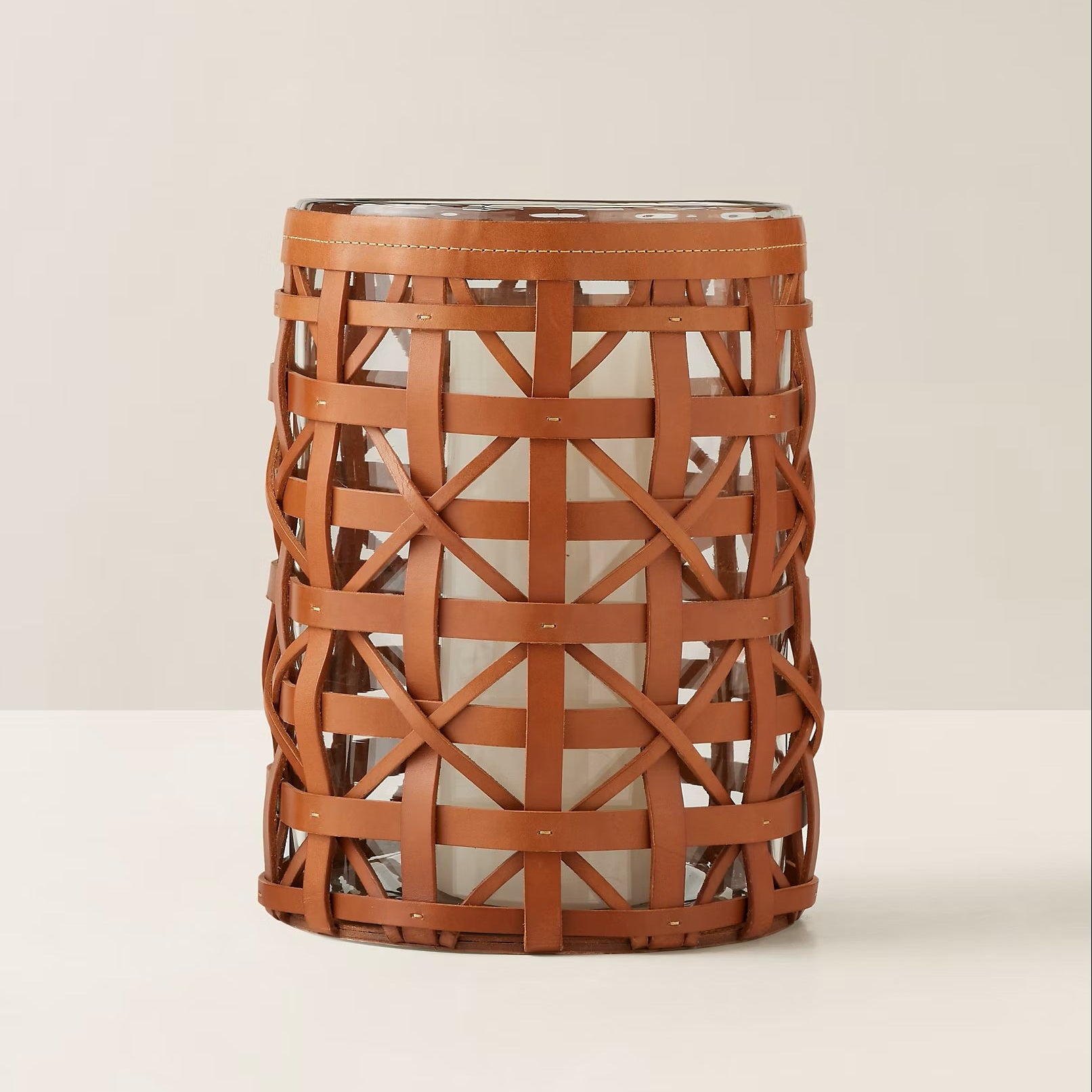 Exquisitely crafted with vegetable-tanned leather, the Preston hurricane from Ralph Lauren Home uses a handwoven technique to create its intricate pattern and ensure each piece is one of a kind. Paired with an interior glass cylinder, the open-worked design allows candlelight to shine outward, diffusing a gentle radiance throughout the room.